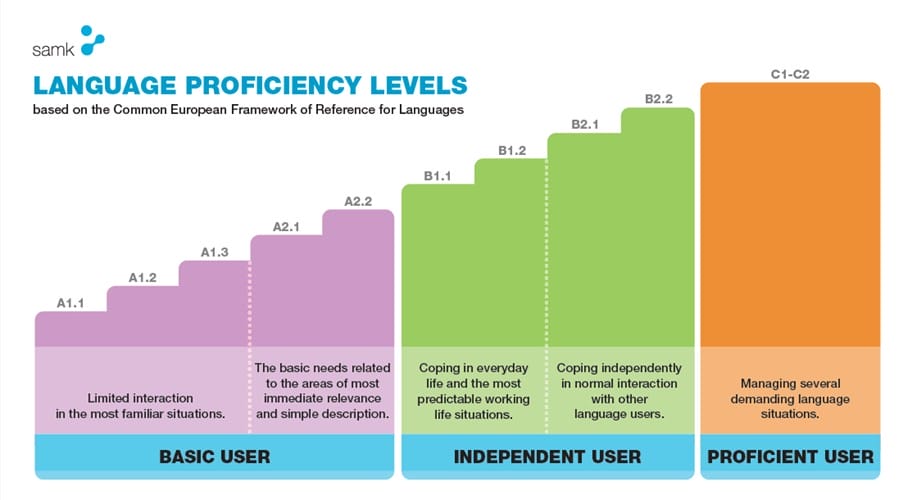 The language proficiency is described with a six-level scale: